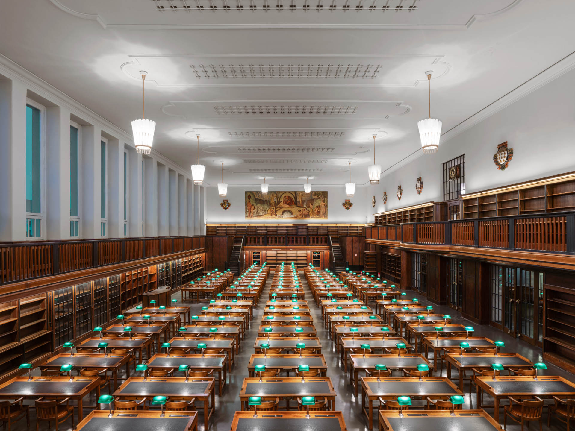 Über den oberen Eingang gelangte ich auf die Brüstung. Von dort fiel der Blick auf das Wandgemälde von Ludwig von Hofmann, das das mythische Arkadien zeigt. Arkadien steht als Sinnbild einer idealisierten Landschaft, eines Ortes von Harmonie und geistiger Ordnung. Anschließend ging ich hinunter zu den 181 Arbeitsplätzen mit ihren grünen Leselampen.