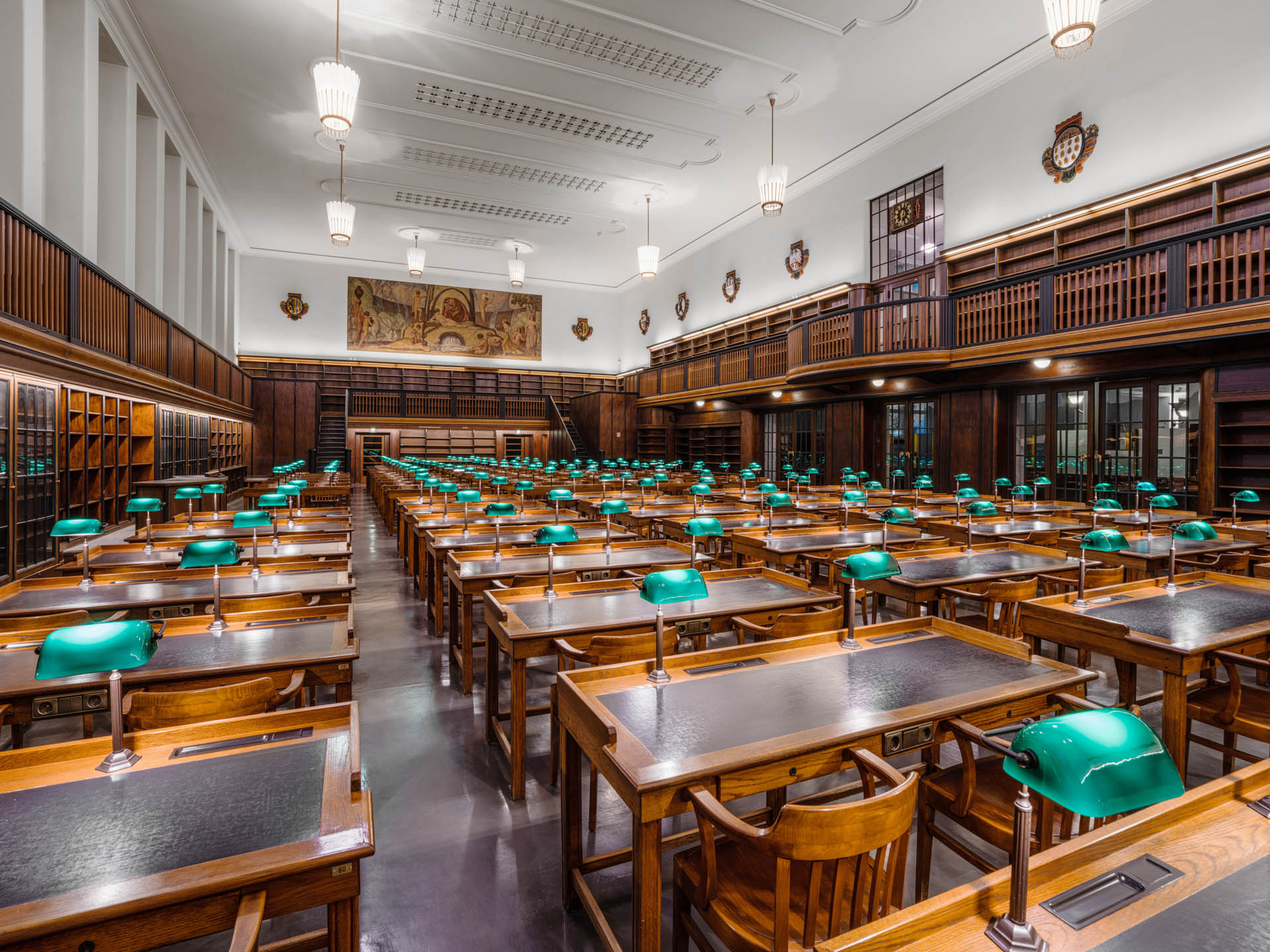 Über den oberen Eingang gelangte ich auf die Brüstung. Von dort fiel der Blick auf das Wandgemälde von Ludwig von Hofmann, das das mythische Arkadien zeigt. Arkadien steht als Sinnbild einer idealisierten Landschaft, eines Ortes von Harmonie und geistiger Ordnung. Anschließend ging ich hinunter zu den 181 Arbeitsplätzen mit ihren grünen Leselampen.